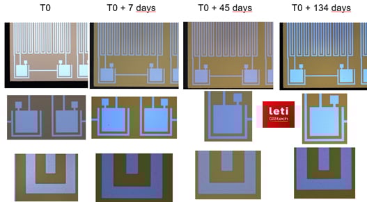 Fig.1: Microimplant electronics protected by Picosun’s ALD HfO2. No changes after soaking in 87 oC PBS for over 3 months which correlates to over 10 years in human body. T0 = starting point of the test. Reference: InForMed project, image source CEA-Leti.