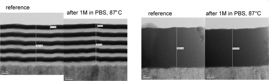 Fig.2: TEM micrographs of Picosun’s ALD nanolaminate and oxide encapsulants after one month soaking tests in 87 oC PBS. No corrosion observed.